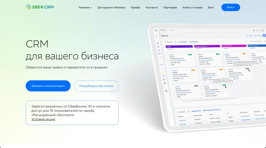 | SberCRM | Русский | Бесплатная версия для сферы услуг | ИИ для прогнозирования, интеграции с другими сервисами, продуманная воронка продаж | От 500 ₽/мес. |
