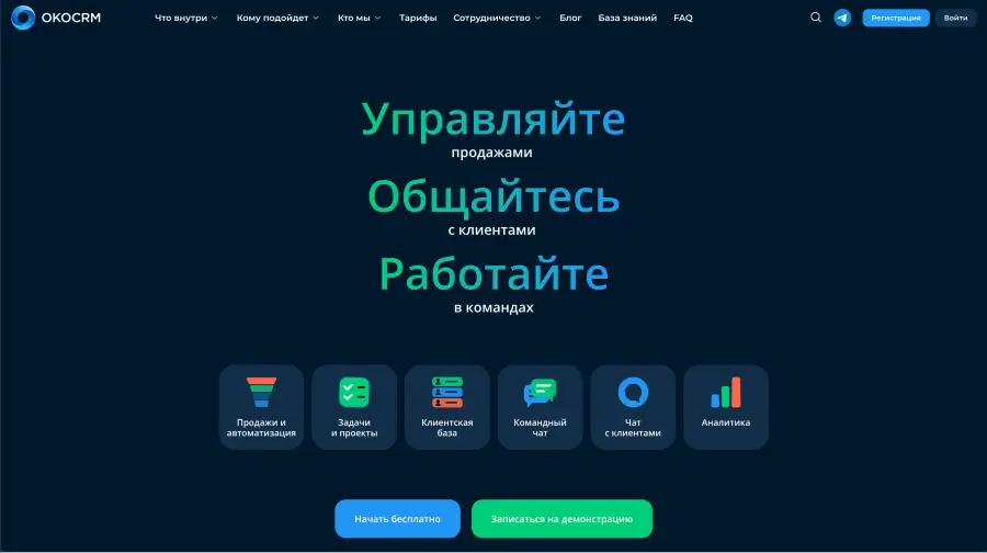 OkoCRM — это платформа, предназначенная для структурирования и автоматизации бизнес-процессов. Благодаря этой системе, ни один клиент не останется без внимания, так как все заявки с сайта, звонки и сообщения из мессенджеров автоматически добавляются в CRM.