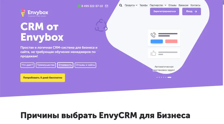 | EnvyCRM | Русский | Пробная версия на 8 дней | Удобный интерфейс, интеграция с мессенджерами и соцсетями, система уведомлений | От 745 ₽/мес. |