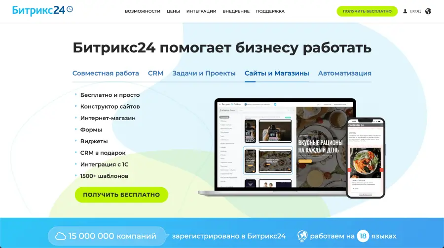 | Битрикс24 | Русский | Бесплатный тариф с ограничением хранилища | Интеграция с продуктами «1С», большое облачное хранилище, подходит для малого бизнеса | От 1 990 ₽/мес. |
