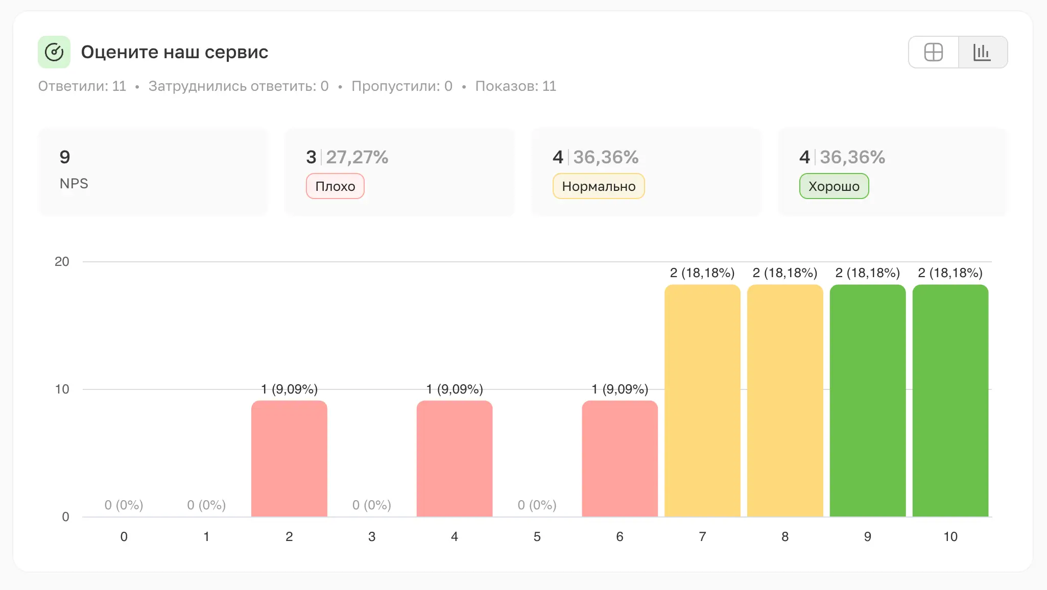 Мы переработали страницу аналитики. Теперь для каждого вопроса можно выбрать удобный способ отображения данных — переключатель в правом верхнем углу карточки: