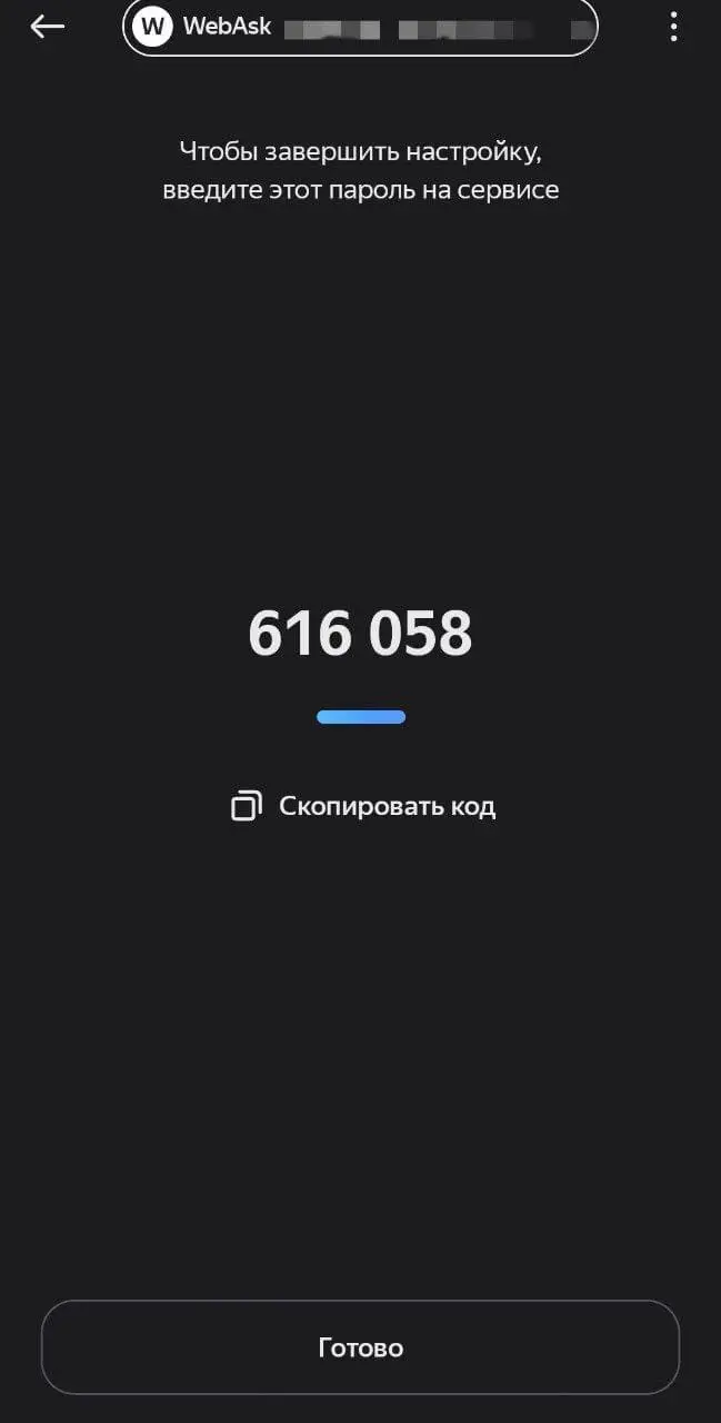 После сканирования QR в приложении появится код с названием «WebAsk [ваша почта]». Введите шестизначный код в настройках двухфакторной аутентификации на странице профиля WebAsk.