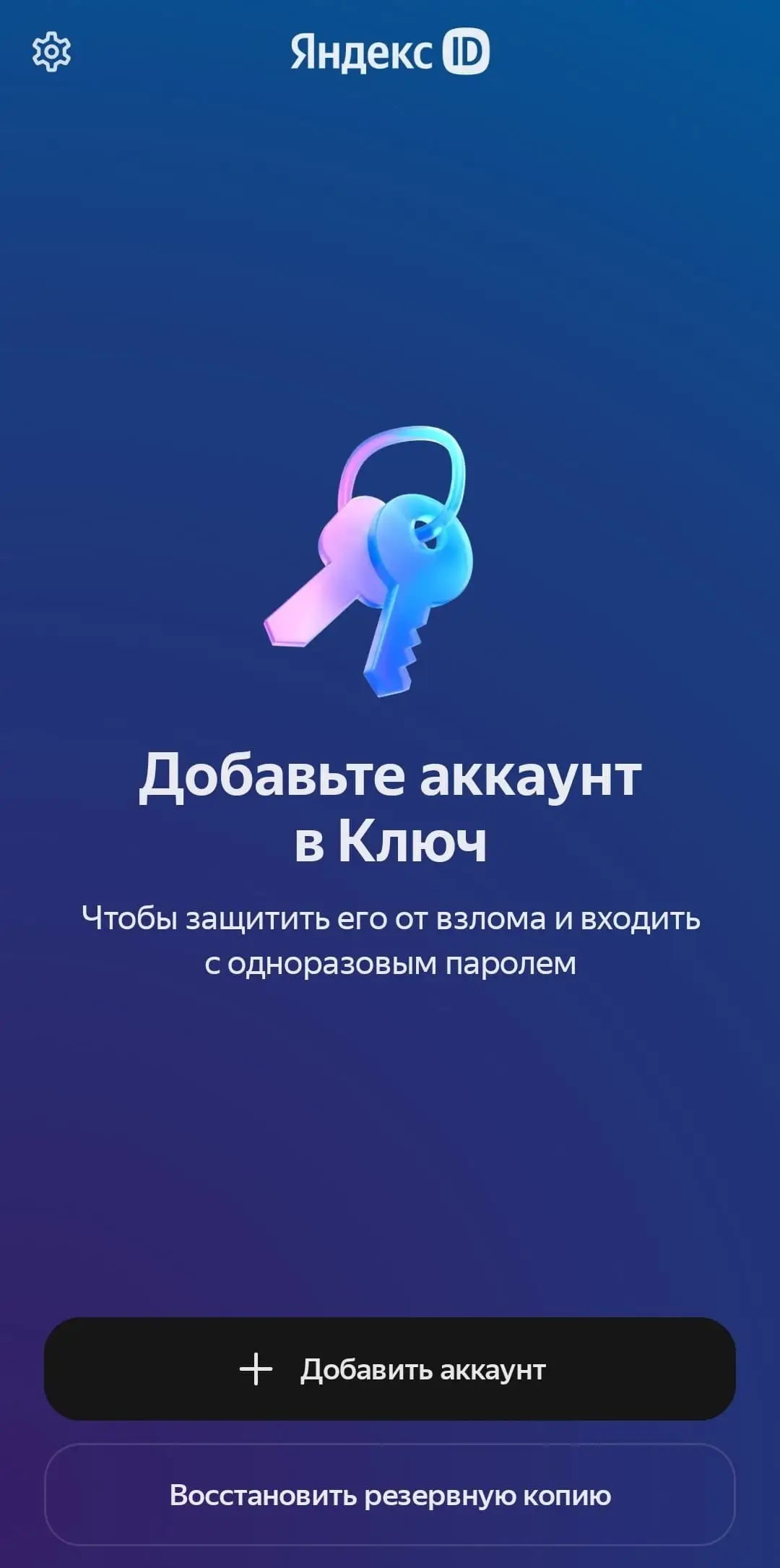 Скачайте и установите приложение Яндекс.Ключ в Google Play или App Store на ваш смартфон. После выполнения установки авторизуйтесь в приложении и нажмите кнопку «Добавить аккаунт».