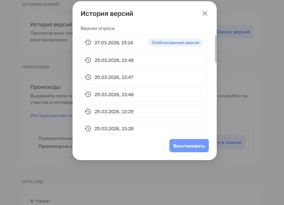 История версий опроса — это функция, которая позволяет вернуться к одному из ранее сохранённых состояний анкеты.