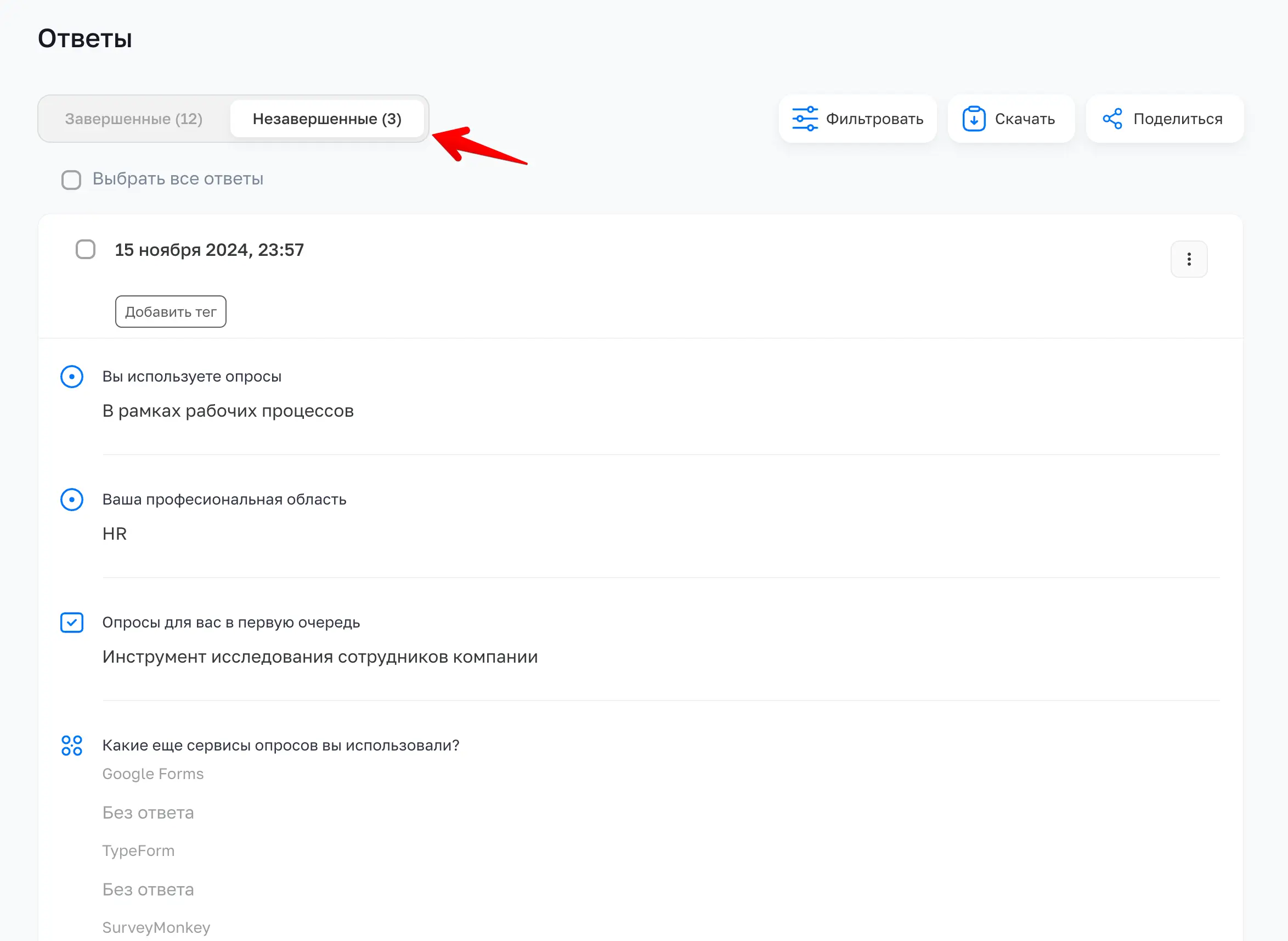 Чтобы посмотреть каждый брошенный опрос по отдельности, перейдите в «Ответы» → «Незавершенные». Вы увидите, какие ответы уже были даны и на каком вопросе всё остановилось.