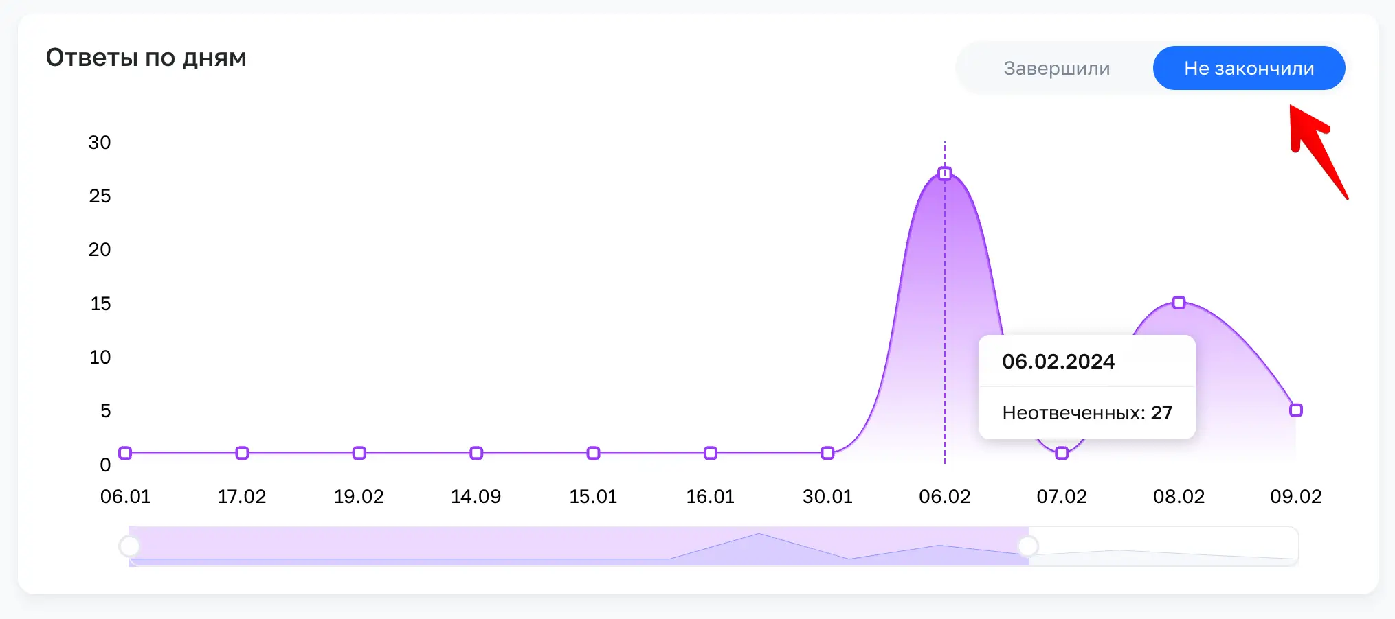 Функция «Незавершенные ответы» показывает, на каком вопросе респонденты бросают ваш опрос. Это помогает понять, что им не понравилось или показалось сложным.
